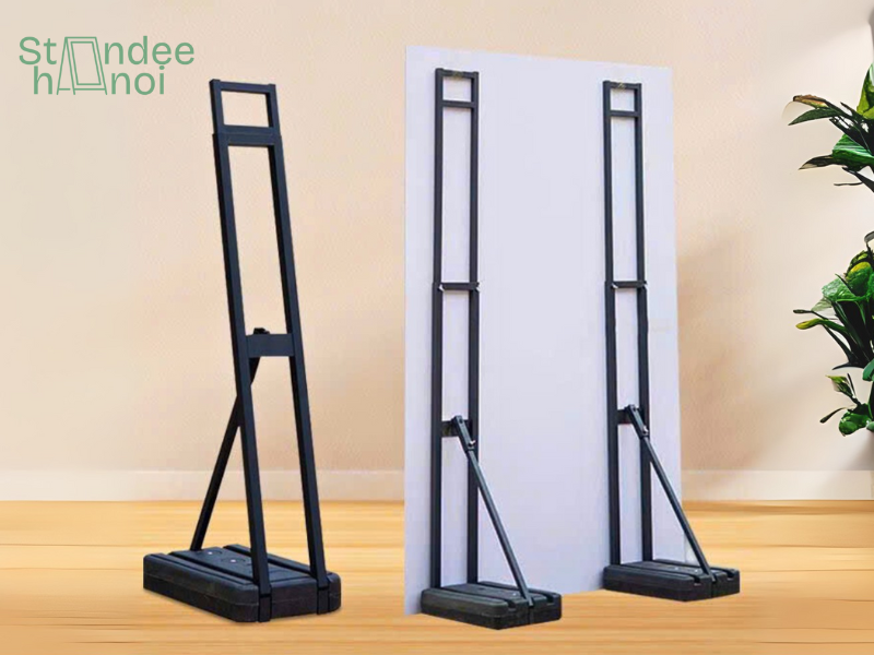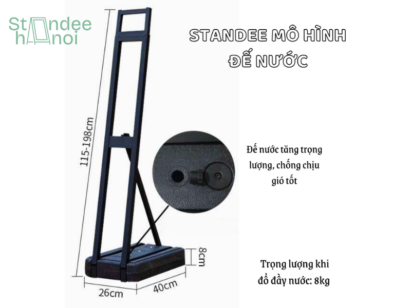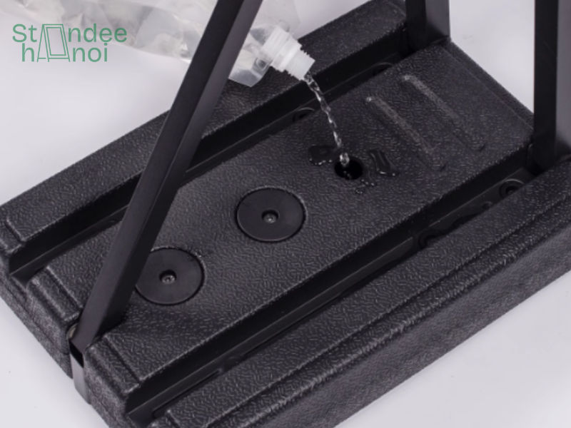 Standee mô hình đế nước có thiết kế phần đế có thể đổ đầy nước hoặc cát, giúp tăng trọng lượng đến 8kg. Điều này giúp sản phẩm giữ vững trên nền đất kể cả trong điều kiện gió mạnh – điều mà các loại standee thông thường không làm được.